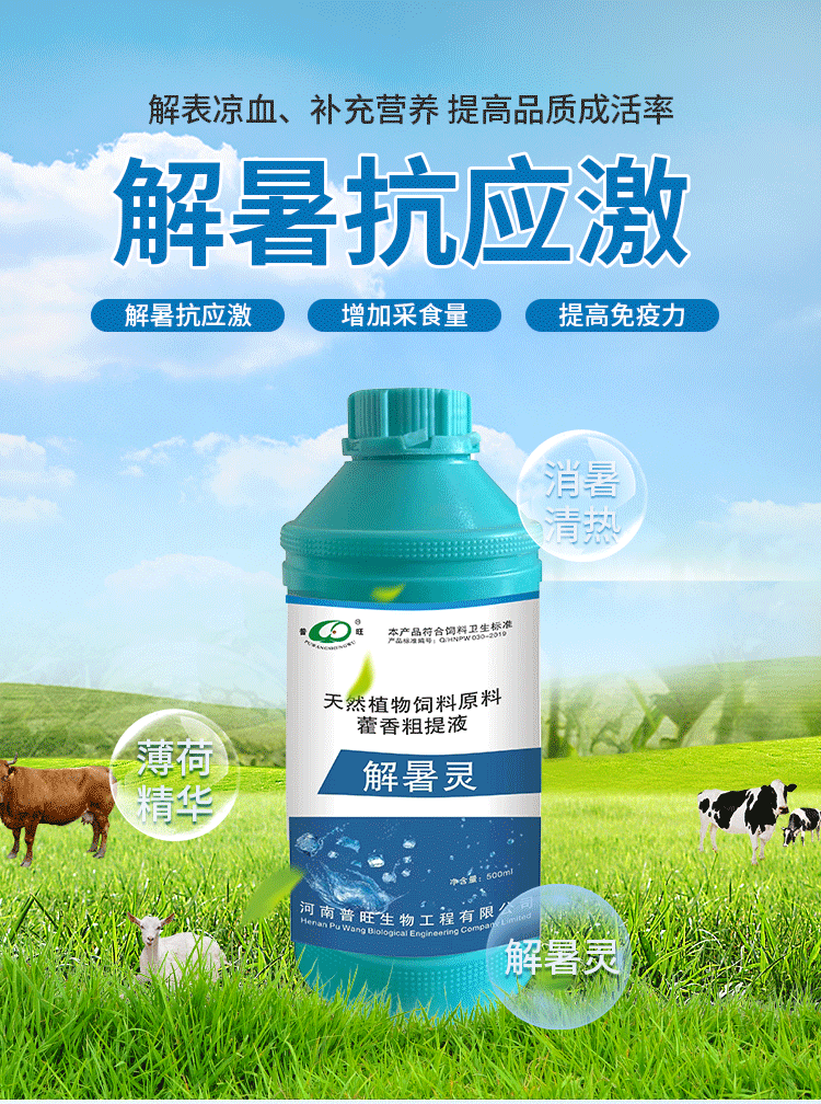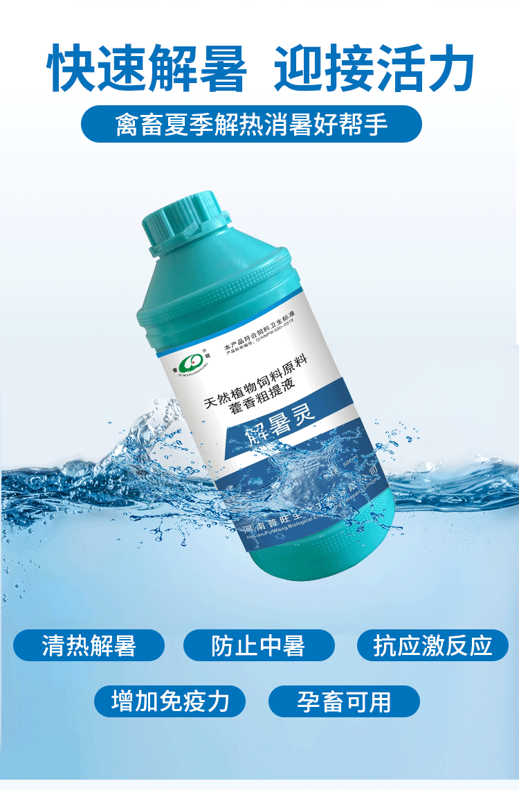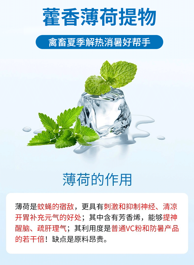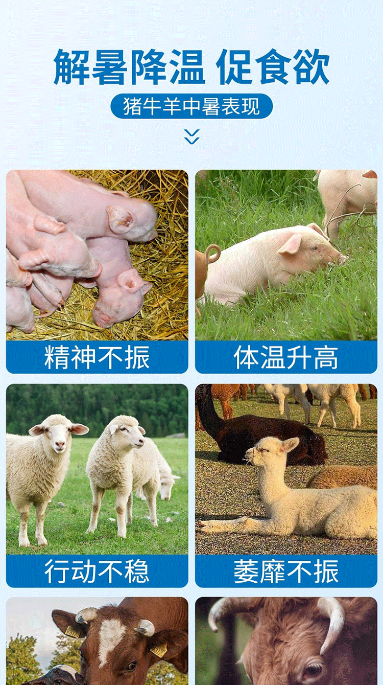 1、解表祛暑,化溫和中,用于采食量下降,喘氣急促,中暑癥,抗應激增強抗病能力,維持機體代謝平衡,促進生長發育等。