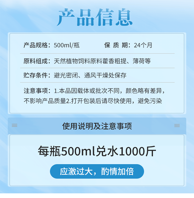 【參考用量】本品每500ml兌水1000斤,自由飲用,連用3-5天,治療量加倍。