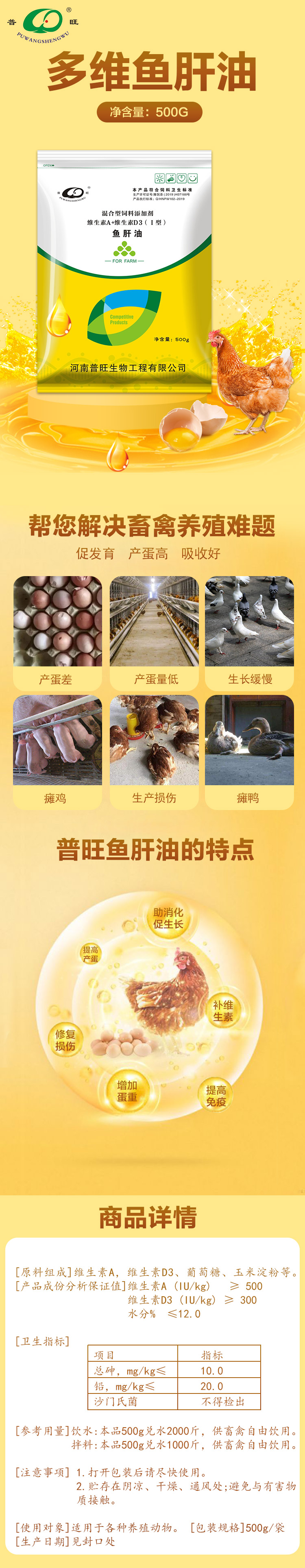 產(chǎn)品簡介:普旺多維魚肝油混合型飼料添加劑 促發(fā)育產(chǎn)蛋高吸收好補充維生素 提高免疫力,助你解決養(yǎng)殖難題。