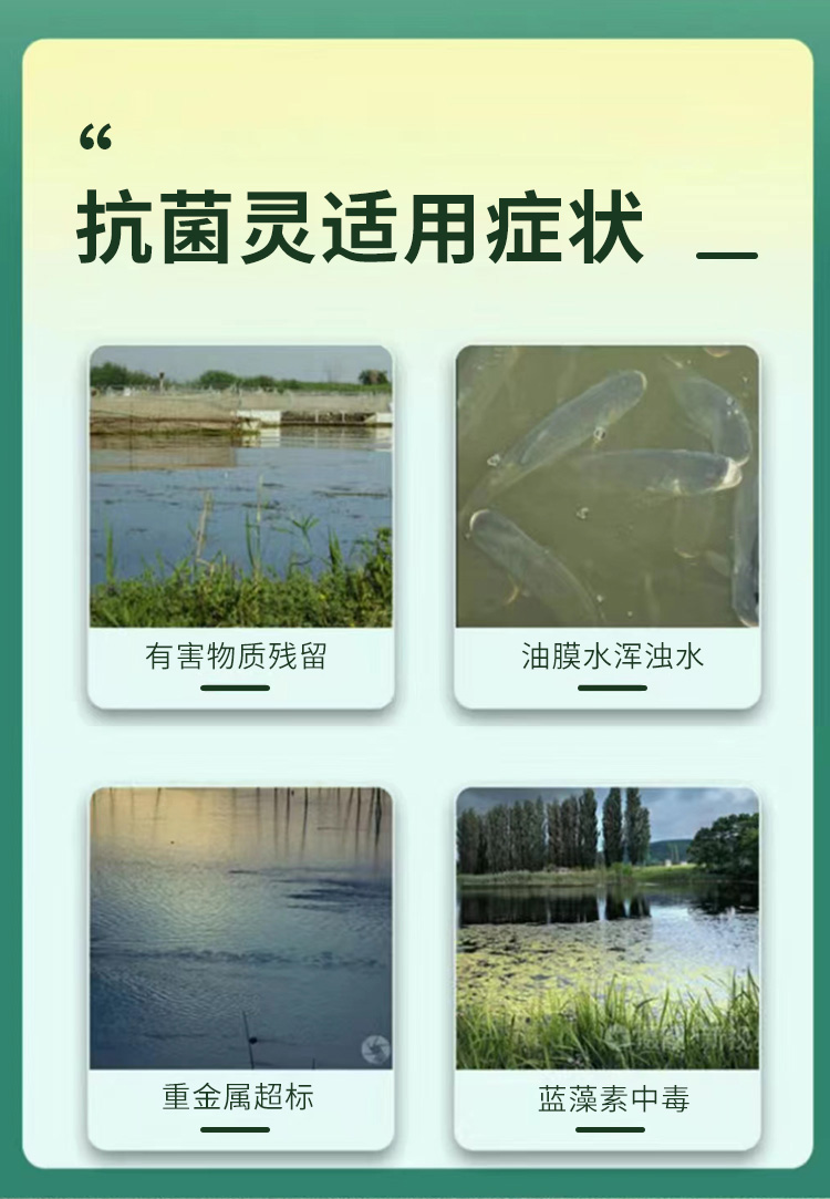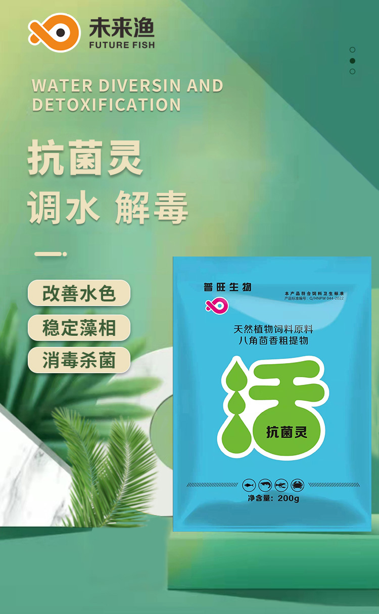 產(chǎn)品簡介:未來漁抗菌靈 解毒調(diào)水改善水色穩(wěn)定藻相消毒殺菌護水解毒靈 分解藥殘緩解應(yīng)激為您的養(yǎng)殖保駕護航 改善水色,穩(wěn)定藻相,消毒殺菌。