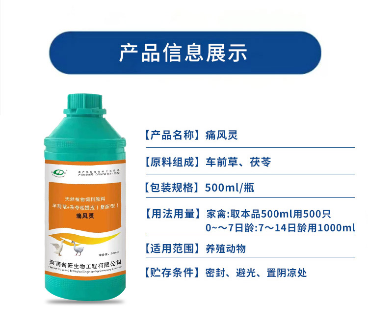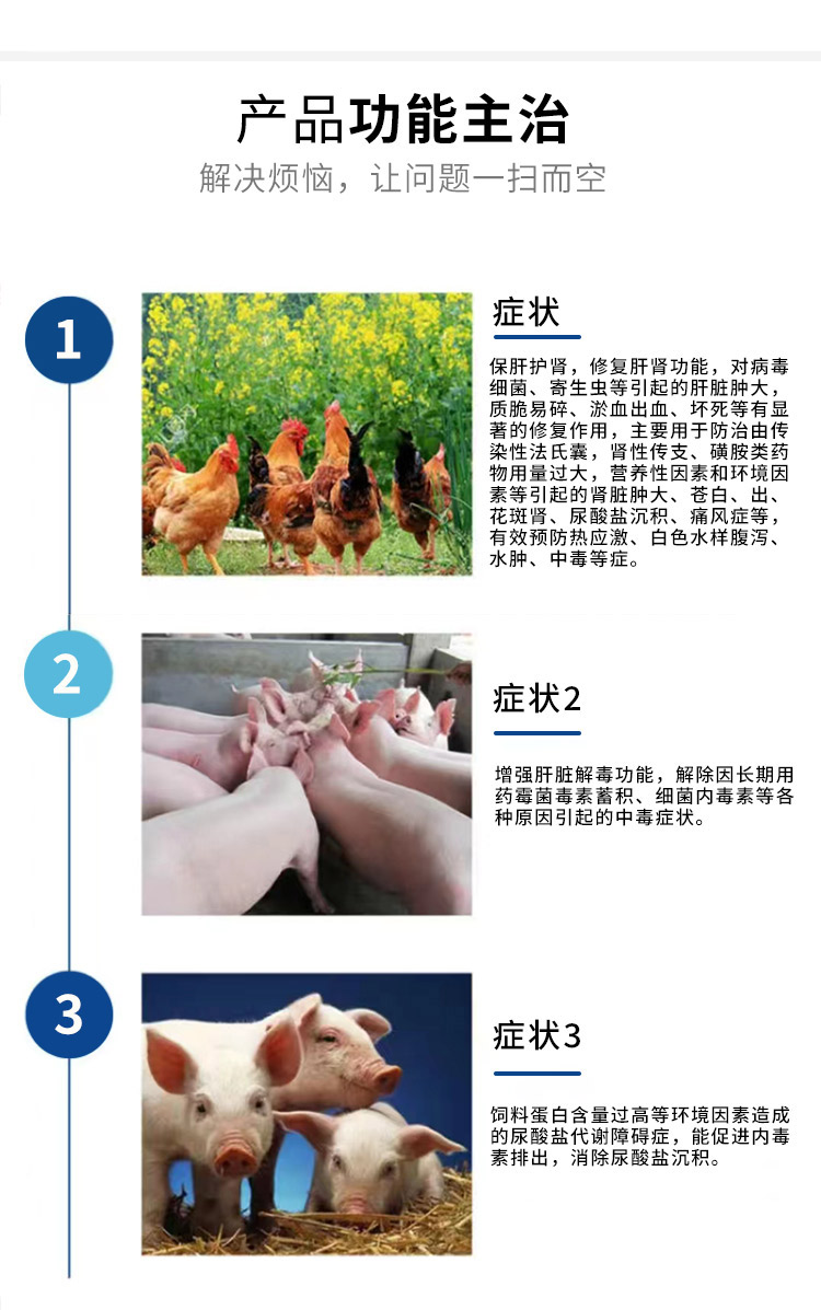 產品簡介:保肝護腎通腎、排毒利尿、增強肝臟解毒能力 混合型飼料添加劑適用對象-雞鴨鵝豬牛羊等畜禽通用。 500ml/瓶 取本品一瓶用500只0-7日齡,7-14日齡用2瓶。